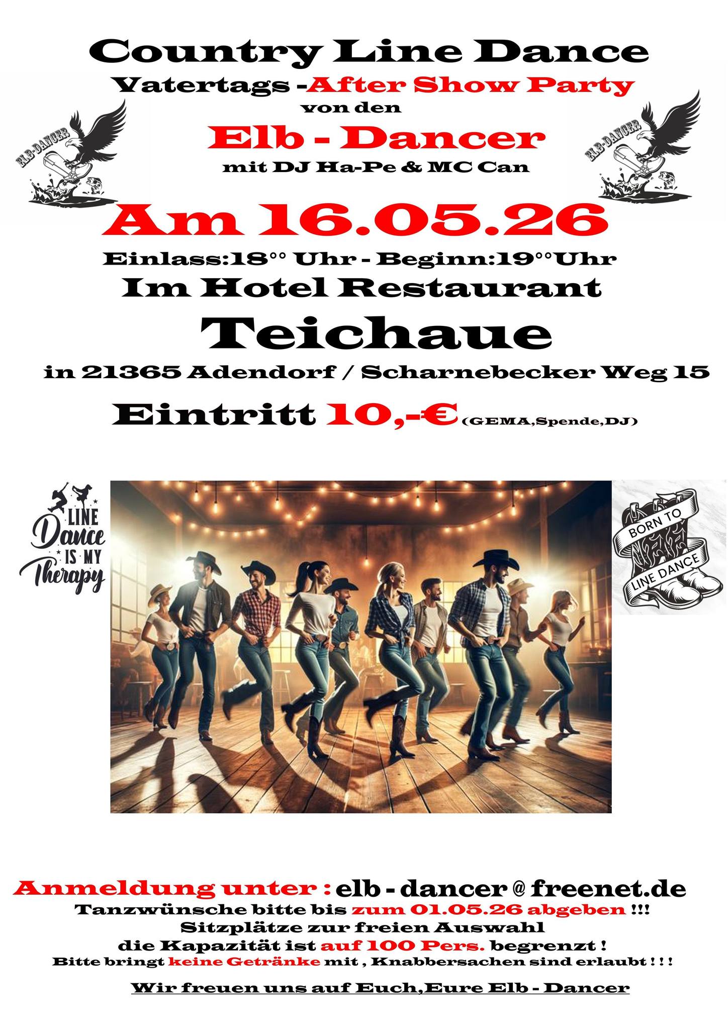 16.05.2026 | Country Line Dance Party der Elb-Dancer mit DJ Ha-Pe & MC Can in 21365 Adendorf, Scharnebecker Weg 15 Einlass: ab 18.00 Uhr Beginn: 19.00 Uhr Eintritt: 10,-€ Anmeldung unter: elb-dancer@freenet.de Tanzwünsche bis 01.05.26 abgeben Eigene Getränke sind nicht erwünscht Flyer: Country Line Dance Party |