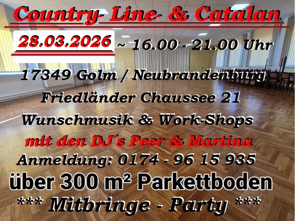 28.03.2026 | Country- Line- & Catalan mit den DJ's Peer & Martina Beginn: 16.00 Uhr Ende: 21.00 Uhr Anmeldung unter: 0174 9615 935 Flyer: Country- Line- & Catalan |