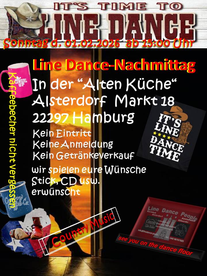 01.02.2026 | Line Dance in der "Alten Küche" in 22297 Hamburg, Alsterdorfer Markt 18 Beginn: 15.00 Uhr Kein Eintritt, keine Anmeldung Flyer: Line Dance Alte Küche |