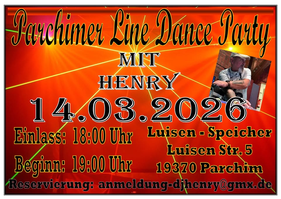 14.03.2026 | Parchimer Line Dance Party mit DJ Henry im Luisen-Speicher in 19370 Parchim, Luisen Str. 5 Einlass: ab 18.00 Uhr Beginn: 19.00 Uhr Anmeldung unter: anmeldung-djhenry@gmx.de |