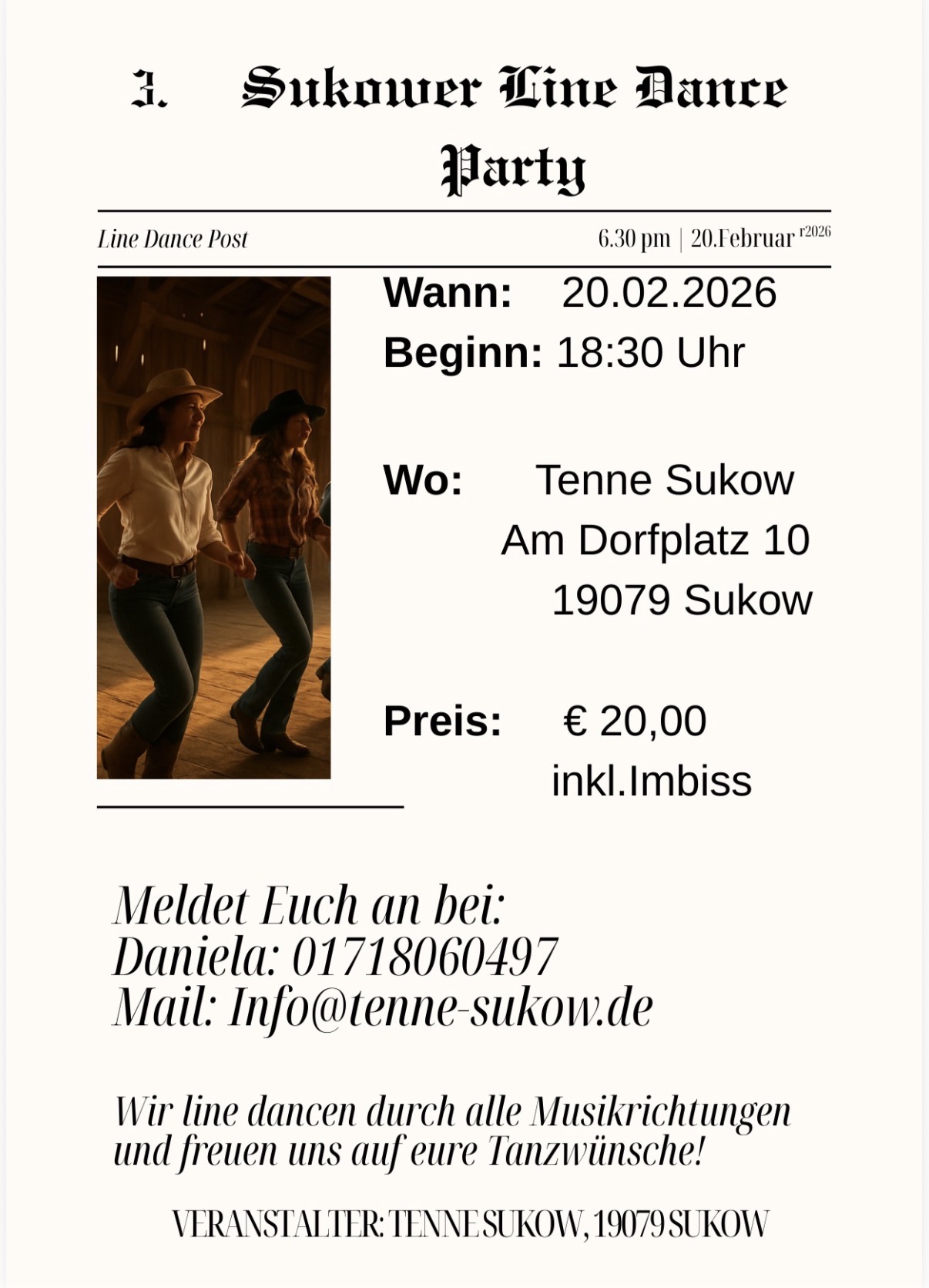 20.02.2026 | 3. Sukower Line Dance Party in der Tenne Sukow in 19079 Sukow, Am Dorfplatz 10 Preis inkl. Imbiss: 20,- € Anmeldung bei Daniela unter: 0171 8060 497 oder per Mail: info@tenne-sukow.de Flyer: 3. Sukower Line Dance Party |