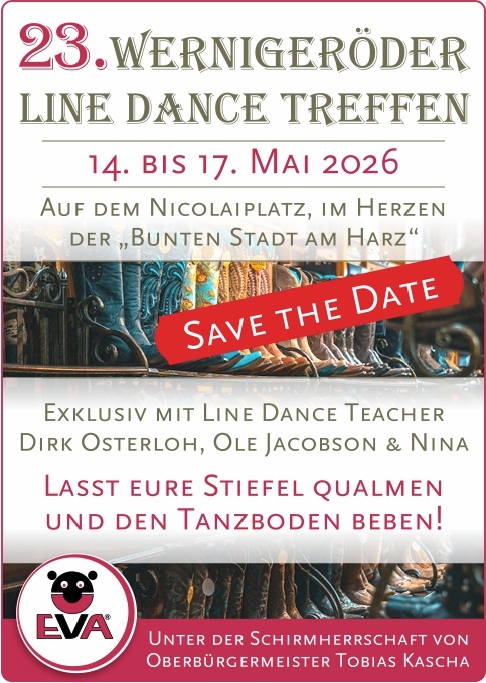 14. - 17.05.2026 | 23. Wernigeröder Line Dance Treffen mit Dirk Osterloh, Ole Jacobson & Nina auf dem Nicolaiplatz in 38855 Wernigerode Flyer: Line Dance Treffen |