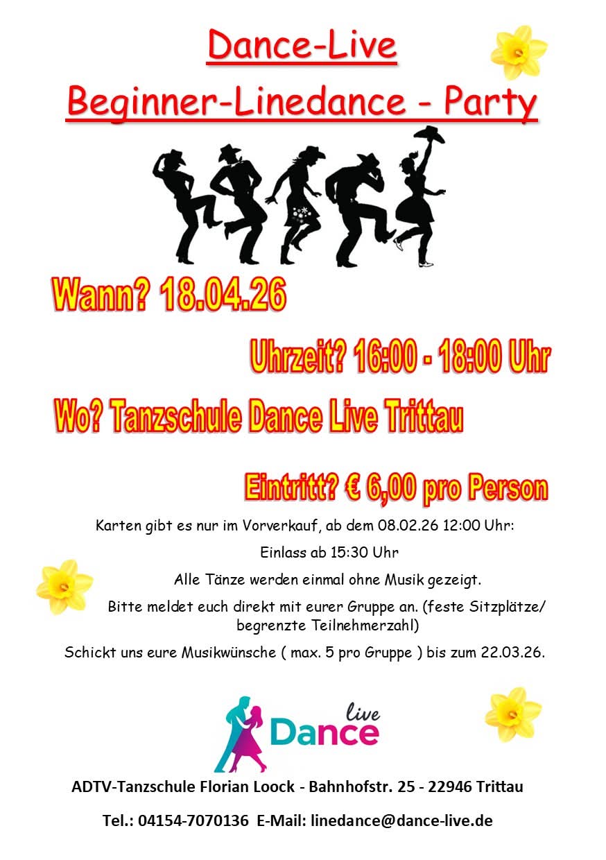 18.04.2026 | Dance-Live in der ADTV-Tanzschule Florian Loock in 22946 Trittau, Bahnhofstrasse 25 Beginner-Line Dance Party: 16.00 - 18.00 Uhr Eintritt: 6,- € Line Dance -Party: 19.00 - 22.30 Uhr Eintritt: 8,- € Anmeldung bis 22.03.26 unter: 04154 7070 136 oder per Mail: linedance@dance-live.de |