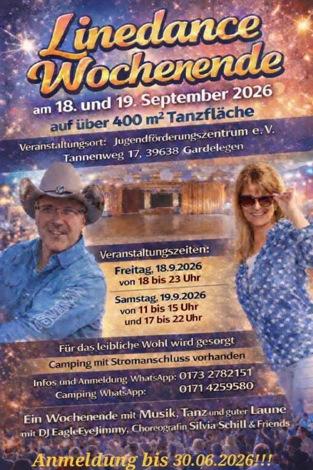 18. & 19.09.2026 | Line Dance Wochenende mit Silvia Schill & DJ EagleEye Jimmy im Jugendförderzentrum in 39638 Gardelegen, Tannenweg 17 Freitag: ab 18.00 Uhr Samstag: ab 11.00 Uhr Anmeldung bis 30.06.26 erwünscht unter WhatsApp: 0173 2782 151 Flyer: Line Dance Wochenende |