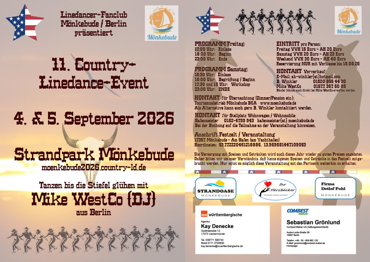 04. & 05.09.2026 | 11. Country-Linedance-Event mit DJ Mike WestCo Am Hafen in 17375 Mönkebude Freitag: Einlass ab 17.00 Uhr, Beginn: 18.00 Uhr Samstag: Einlass ab 15.30 Uhr, Beginn: 16.00 Uhr mit der Begrüßung Weiter Info unter: Termine Mike WestCo Flyer: 11. Country-Linedance-Event |