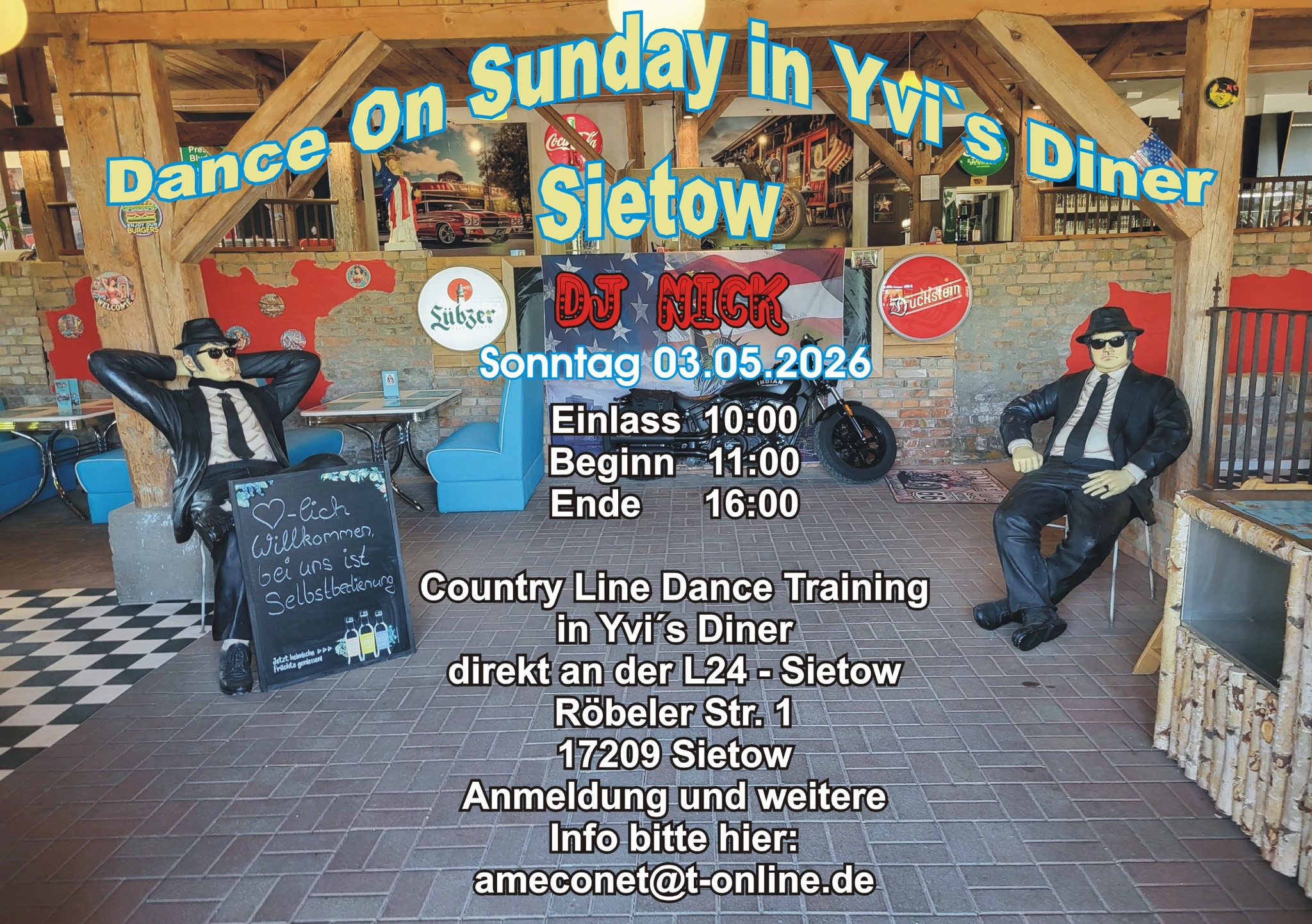 03.05.2026 | Dance On Sunday in Yvi's Diner mit DJ Nick in 17209 Sietow, Röbeler Str. 1 Einlass: ab 10.00 Uhr Beginn: 11.00 Uhr Ende: 16.00 Uhr Anmeldung und weitere Info unter: ameconet@t-online.de Flyer: Dance On Sunday |