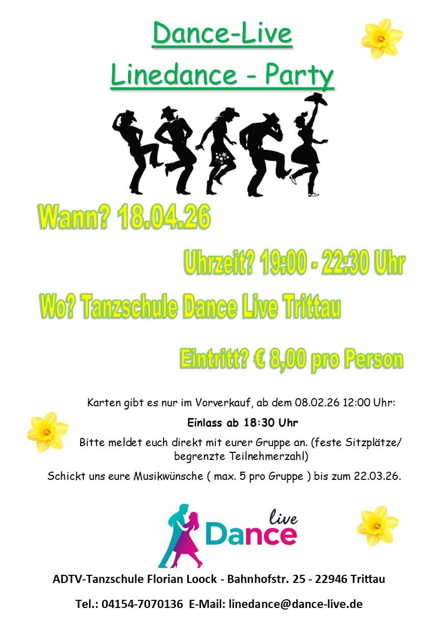 18.04.2026 | Dance-Live in der ADTV-Tanzschule Florian Loock in 22946 Trittau, Bahnhofstrasse 25 Beginner-Line Dance Party: 16.00 - 18.00 Uhr Eintritt: 6,- € Line Dance -Party: 19.00 - 22.30 Uhr Eintritt: 8,- € Anmeldung bis 22.03.26 unter: 04154 7070 136 oder per Mail: linedance@dance-live.de |
